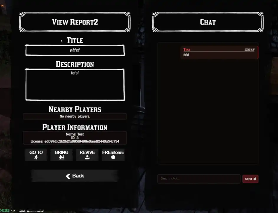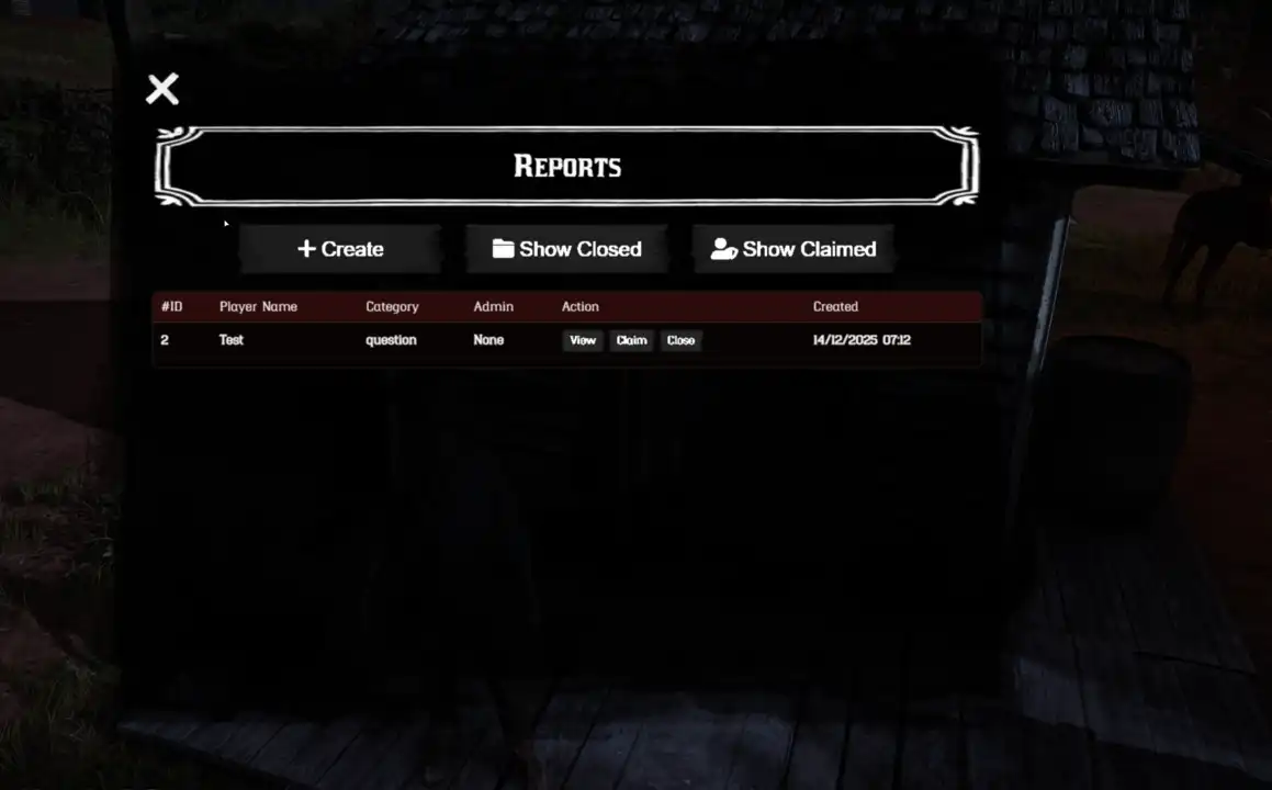 Admins gain access to a real-time report queue where they can claim cases, message players, close, reopen, or delete reports, and perform essential moderation actions like teleport, bring, revive, and freeze — all handled securely server-side. Every major action can be logged directly to Discord using configurable webhooks, ensuring transparency and staff accountability.