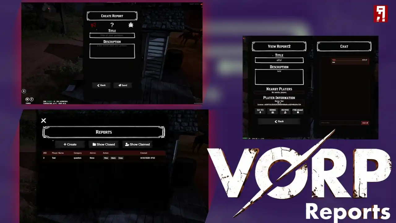 VORP Reports is a full-featured reporting workflow designed for modern RedM roleplay servers. Players can submit categorized reports such as reports, questions, or bugs, including a title, detailed description, automatic location capture, and nearby player detection for better context.