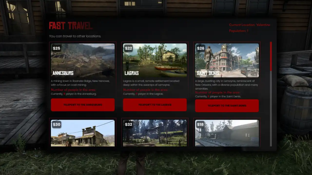Fast Travel lets players jump between predefined towns for a configurable price. It supports VORP, RSG, or RedEM frameworks (auto-detected by default), optional free travel by job, Discord webhook logging, localization, and a skinnable NUI built with CSS variables.